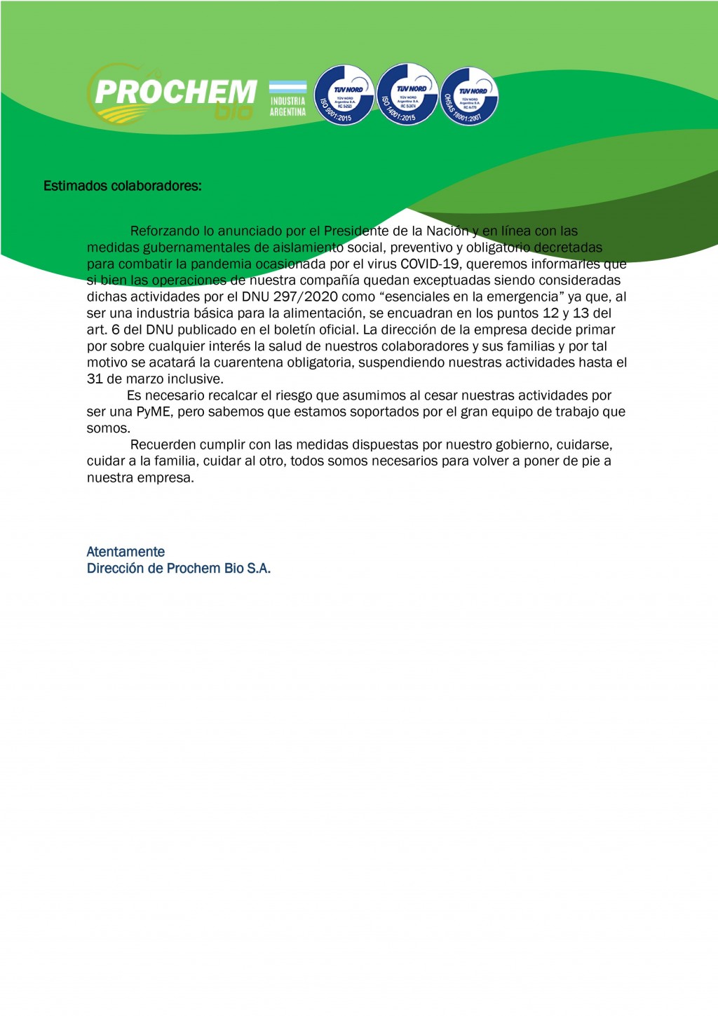 La compañía ubicada en el parque industrial Comirsa informó que como consecuencia de la pandemia provocada por el COVID-19 no estará operando hasta el 31 de marzo cuidando la salud de los operarios y sus familias.