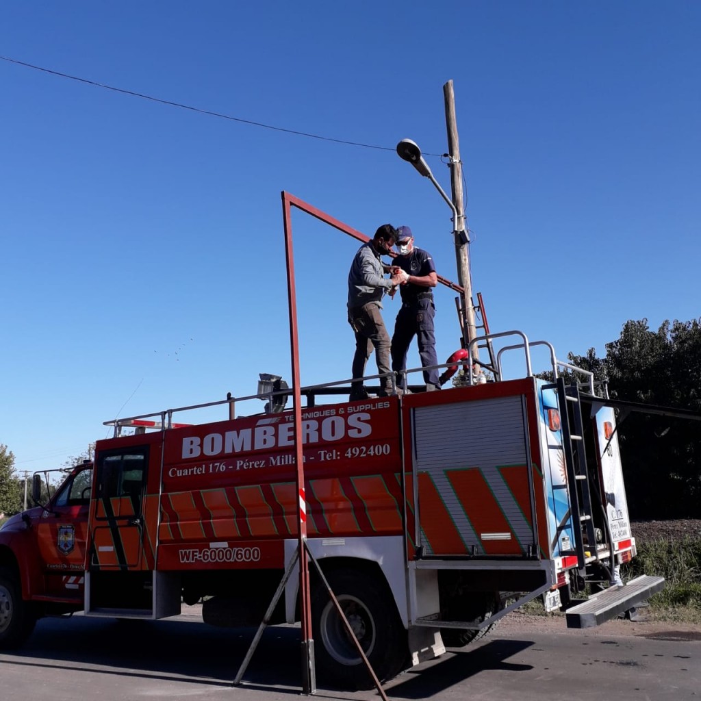 �?‘? La Delegación Municipal conjuntamente con la Sociedad de Bomberos Voluntarios de Pérez Millán, llevaron adelante el proyecto de construcción y puesta en marcha del Arco de Sanitización de Vehículos colocado en el ingreso principal de la localidad.