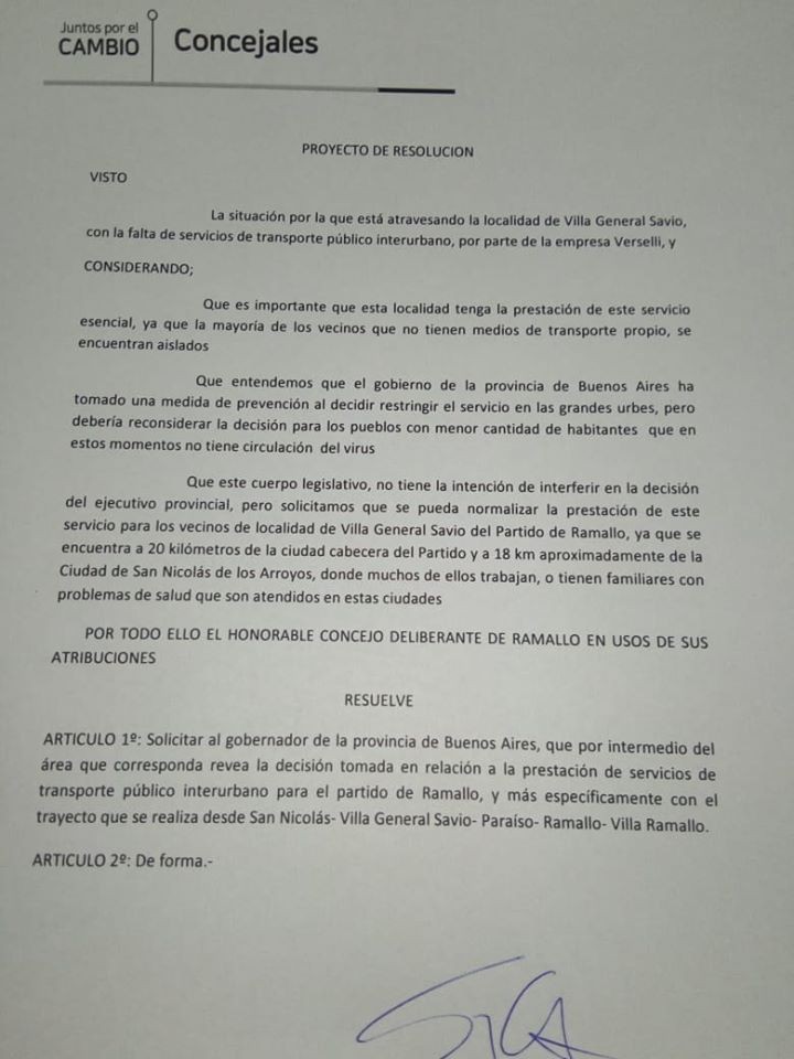 "Hoy presenté un proyecto de resolución en el que solicitamos al Gobernador de la provincia que revea la decisión tomada de suspender las líneas de transporte interurbanas en las pequeñas localidades como es el caso de Villa General Savio, afectando a decena de vecinos en su vida cotidiana" manifestó.