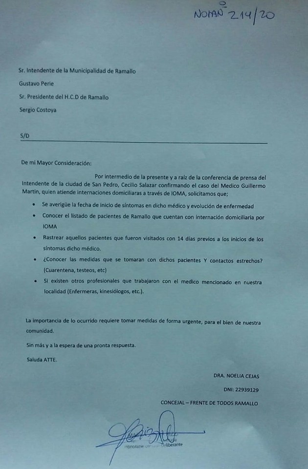 Debido a los Hechos de publico conocimiento acerca de la confirmación de Covid-19, del medico oriundo de San Pedro, quien prestara servicio en nuestra localidad a través de IOMA Solicitamos al Intendente el Pronto Accionar para cuidar a nuestra comunidad.
