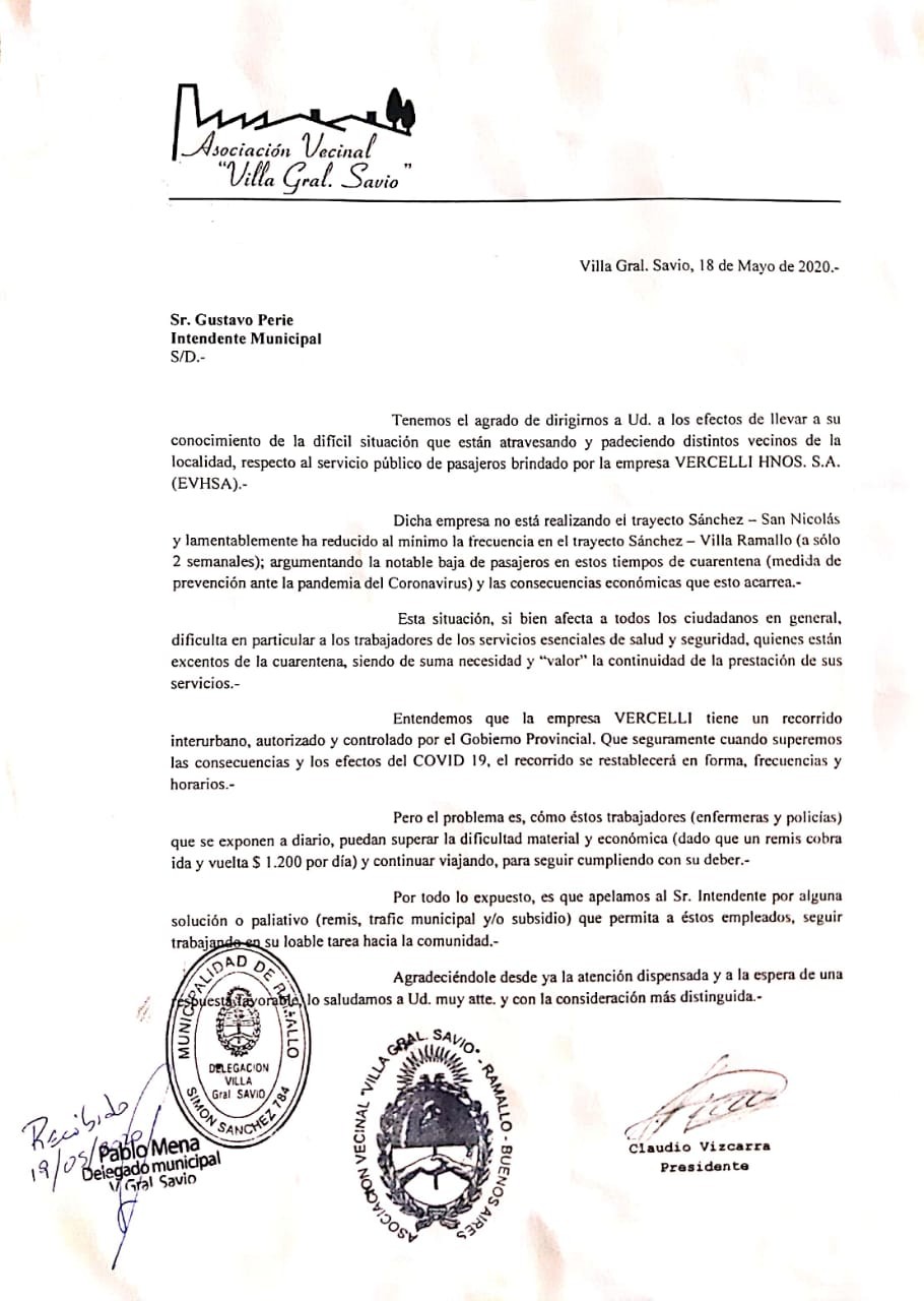 Este martes integrantes de la Vecinal de Villa General Savio enviaron esta nota con el pedido para restablecer el transporte público que une a la localidad con Ramallo, Villa Ramallo y San Nicolás.