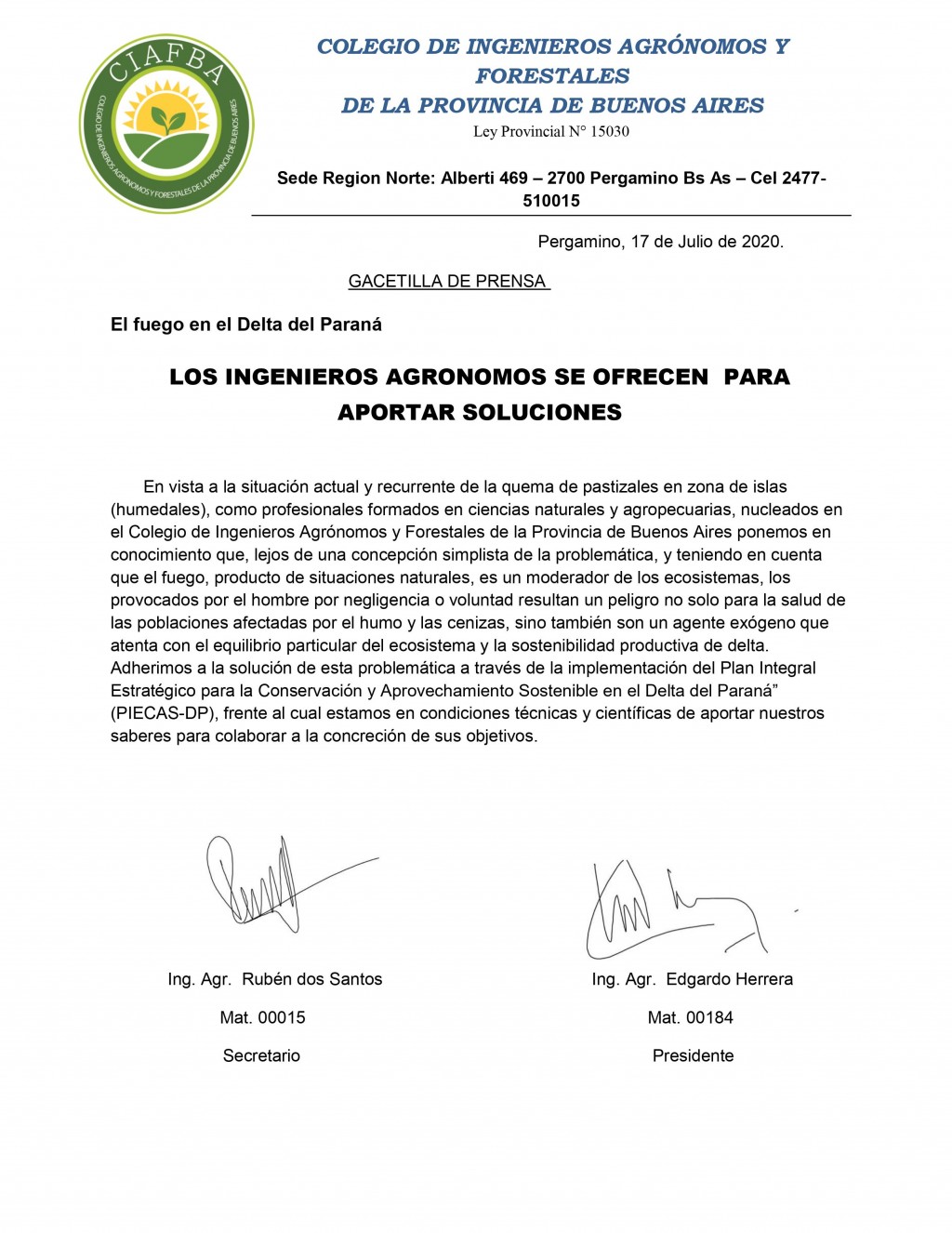 En vista a la situación actual y recurrente de la quema de pastizales en zona de islas (humedales), como profesionales formados en ciencias naturales y agropecuarias, nucleados en el Colegio de Ingenieros Agrónomos y Forestales de la Provincia de Buenos Aires ponemos en conocimiento que, lejos de una concepción simplista de la problemática, y teniendo en cuenta que el fuego, producto de situaciones naturales, es un moderador de los ecosistemas, los provocados por el hombre por negligencia o voluntad resultan un peligro no solo para la salud de las poblaciones afectadas por el humo y las cenizas, sino también son un agente exógeno que atenta con el equilibrio particular del ecosistema y la sostenibilidad productiva de delta.
