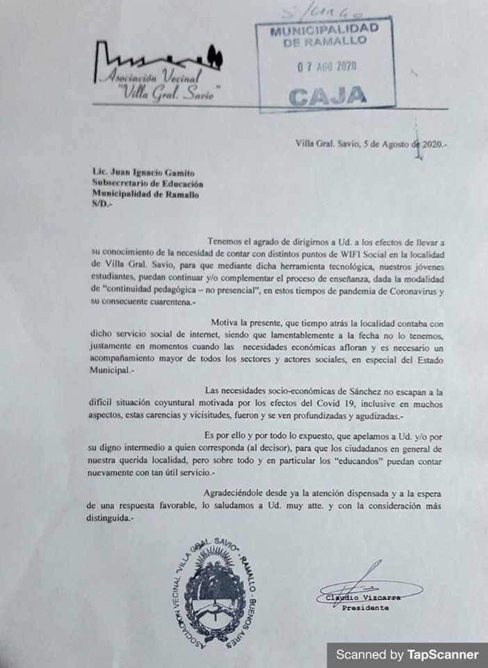 La Comisión Vecinal envió una nota al Subsecretario de Educación de la Municipalidad de Ramallo, solicitando poder contar nuevamente con Internet Social en Villa Gral. Savio, en especial en estos tiempos de Pandemia del Coronavirus y en particular por la importancia de contar con una importante herramienta tecnológica frente a la continuidad pedagógica para nuestros jóvenes alumnos (dado que lamentablemente no pueden ir a clases a las aulas).