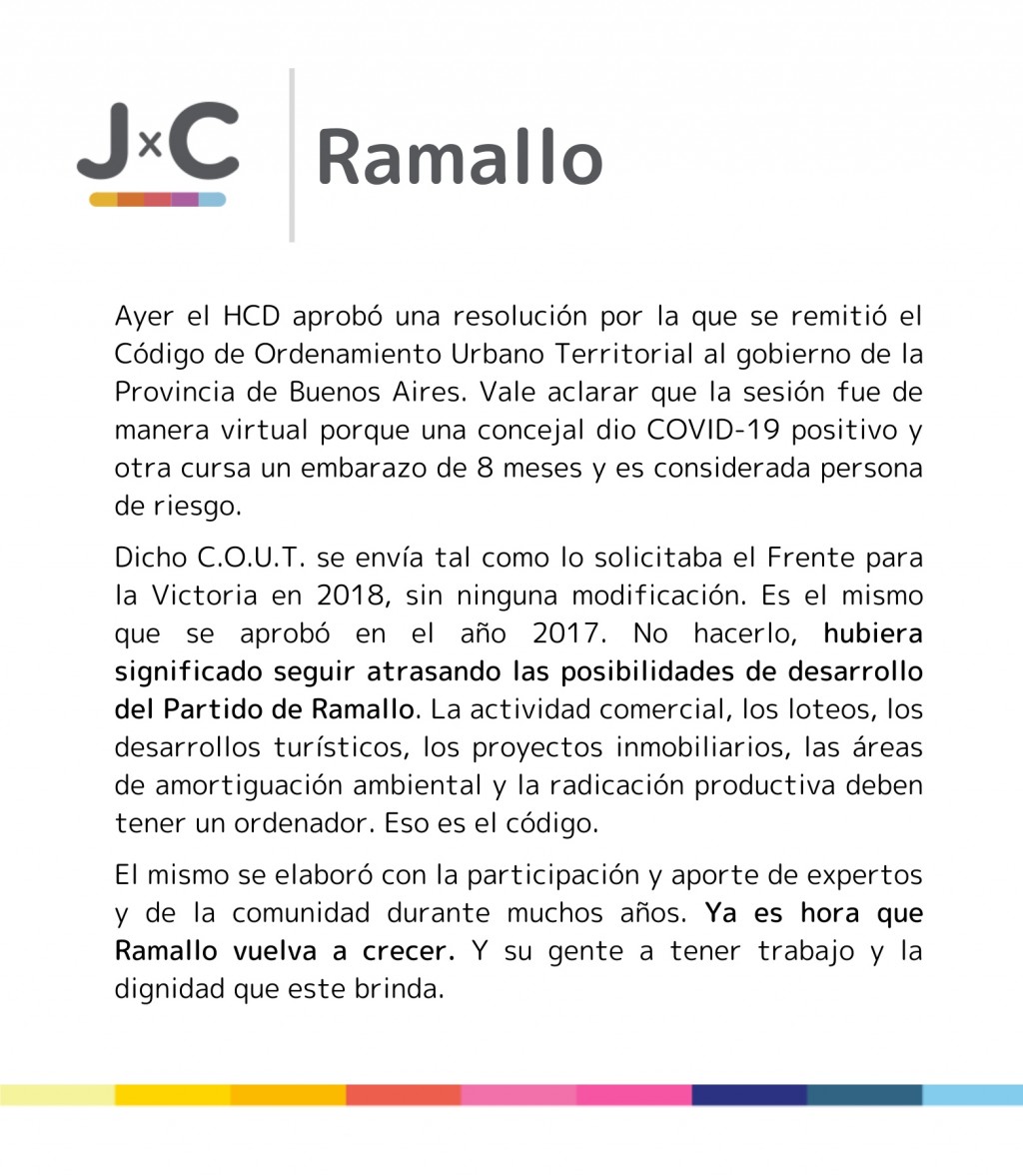 Dicho COUT se envía tal como lo solicitaba el Frente para la Victoria en 2018, sin ninguna modificación. Es el mismo que se aprobó en 2017. No hacerlo, hubiera significado seguir atrasando las posibilidades de desarrollo del partido de Ramallo. La actividad comercial, los loteos, los desarrollos turísticos, los proyectos inmobiliarios, las áreas de amortiguación ambiental y la radicación productiva deben tener un ordenador. Eso es el código.