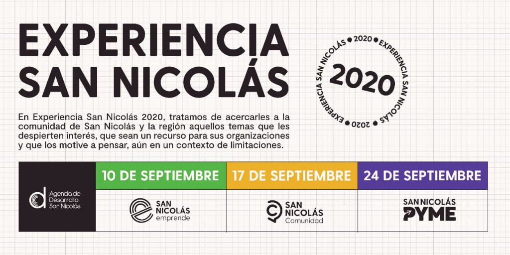 La Agencia de Desarrollo San Nicolás junto a la Federación de Comercio e Industria, y con el apoyo de la Municipalidad, invitan al evento Experiencia San Nicolás 2020, los días 10, 17 y 24 de septiembre, de 18:00 a 20:00 hs, en modalidad online.