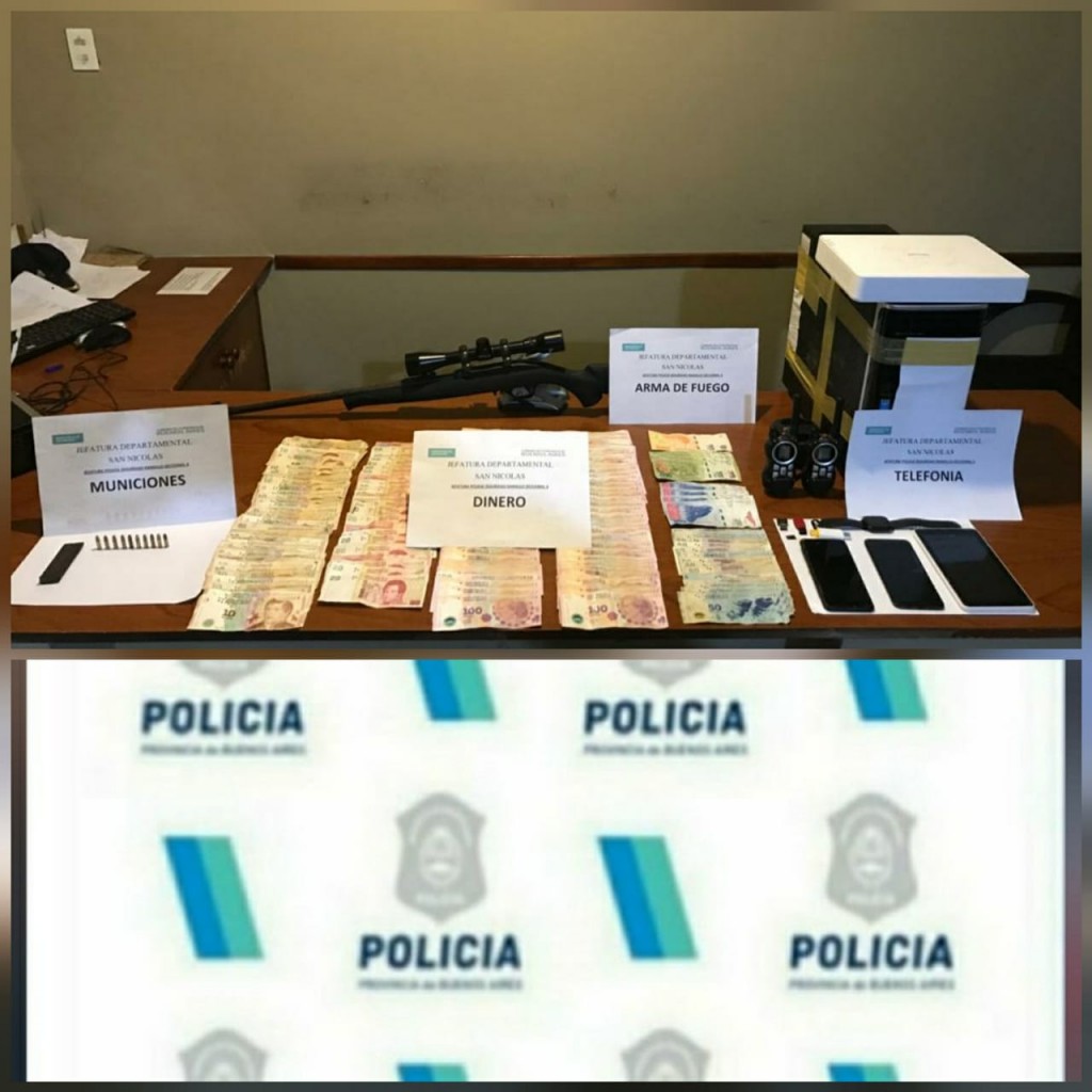 Referente al Puerto secos de la Ruta 9 kilómetro 211 conocido comimos Rosadita se dio cumplimiento a Orden de Allanamiento otorgado Juzgado Garantías 02 personal GTO está. Juntamente con personal EPCR Primera. Subestación Policía Comunal Pérez Millán personal Gad. y DDI Ramallo, e Morada de calle Güemes al 500 Pérez Millán Arrojando resultados Positivo. secuestrando elementos de interés para la causa. dinero en efectivo pesos. Telefonía celular. Computadora CPU. Handy portátil Documentación varias. Arma de fuego Carabina 22 con mira telescópica.