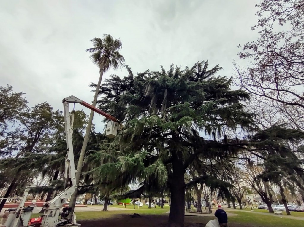 La Secretaría de Obras y Servicios Públicos comenzó a desarrollar un tratamiento de saneamiento en árboles afectados por una plaga en la Plaza José María Bustos.