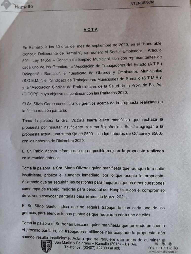 Marta Oliveros Secretaria general del Sindicato de Obreros y Empleados Municipales de Ramallo informó vía whatsApp que se cerró la paritaria municipal. En el contacto envió la información del acta suscripta entre las autoridades municipales y los gremios.