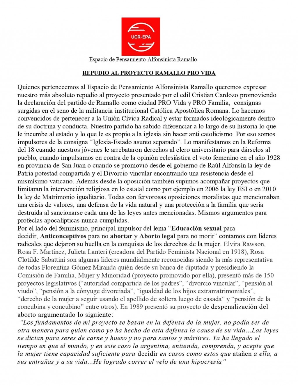Quienes pertenecemos al Espacio de Pensamiento Alfonsinista Ramallo queremos expresar nuestro más absoluto repudio al proyecto presentado por el edil Cristian Cardozo promoviendo la declaración del partido de Ramallo como ciudad PRO Vida y PRO Familia, consignas surgidas en el seno de la militancia institucional Católica Apostólica Romana. Lo hacemos convencidos de pertenecer a la Unión Cívica Radical y estar formados ideológicamente dentro de su doctrina y conducta.
