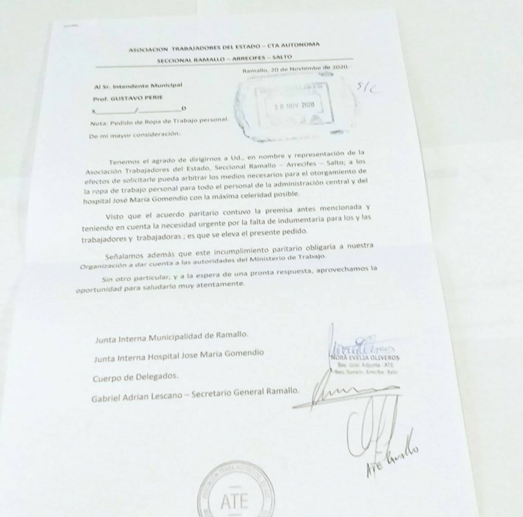 ✅ATE RAMALLO, ARRECIFES, SALTO también solicita al ejecutivo poder arbitrar los medios necesarios para el otorgamiento de la ropa de trabajo para todo el personal de la administración central y del hospital José María Gomendio con la máxima celeridad posible. Recordemos que el acuerdo paritario, alcanzado entre el poder ejecutivo municipal y las organizaciones gremiales, contuvo la premisa del otorgamiento de dicha indumentaria.