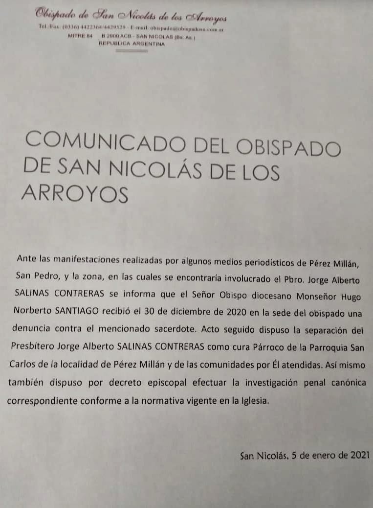 La publicación realizada en la red social Facebook Obispado San Nicolás de los Arroyos expresa que se realiza una investigación de acuerdo al derecho canónico en forma paralela a la investigación judicial.