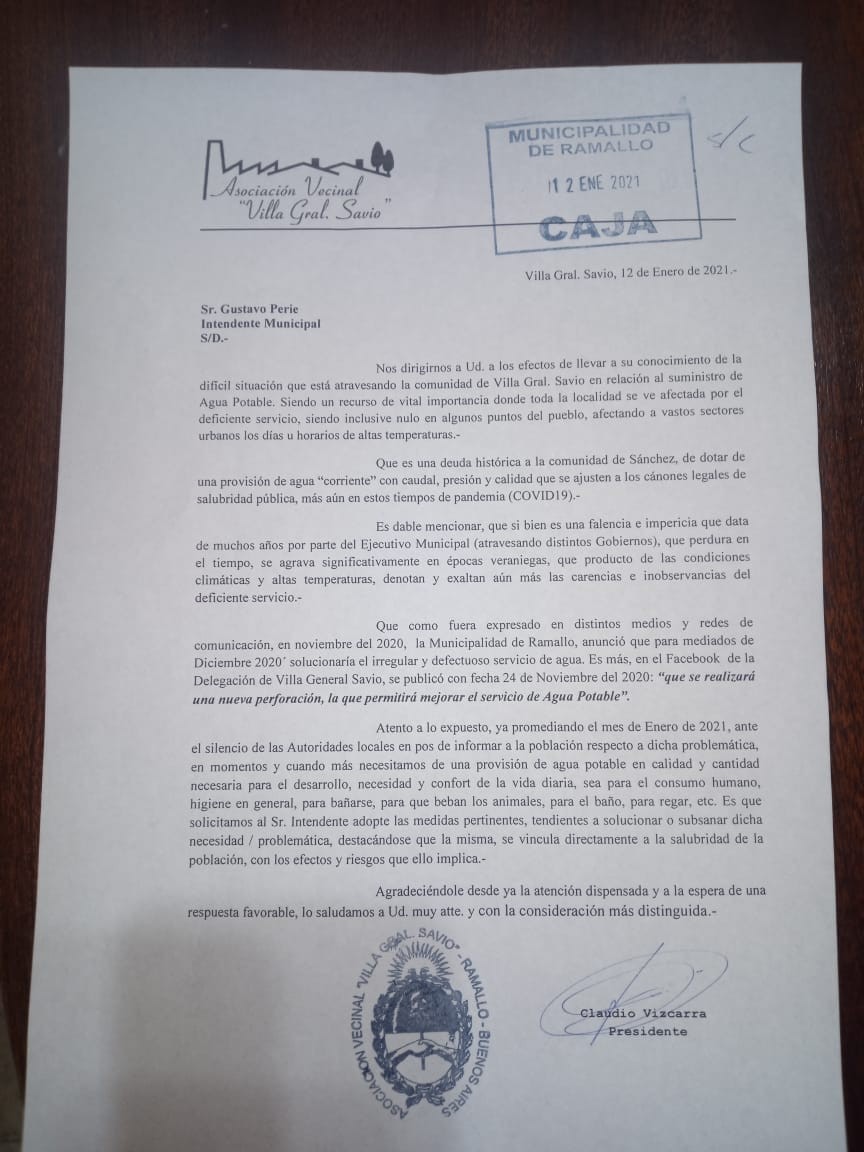 "Sabemos que es problema de todos los tiempos y de todos los gobiernos pero la situación actualmente es intolerable, la falta de agua en nuestro pueblo es falta de un recurso básico, esencial y debe ser prioridad para las autoridades. Esperamos los vecinos de Sánchez una pronta respuesta y una urgente solución" expresa el posteó realizada en el Facebook de la Vecinal de Villa General Savio.