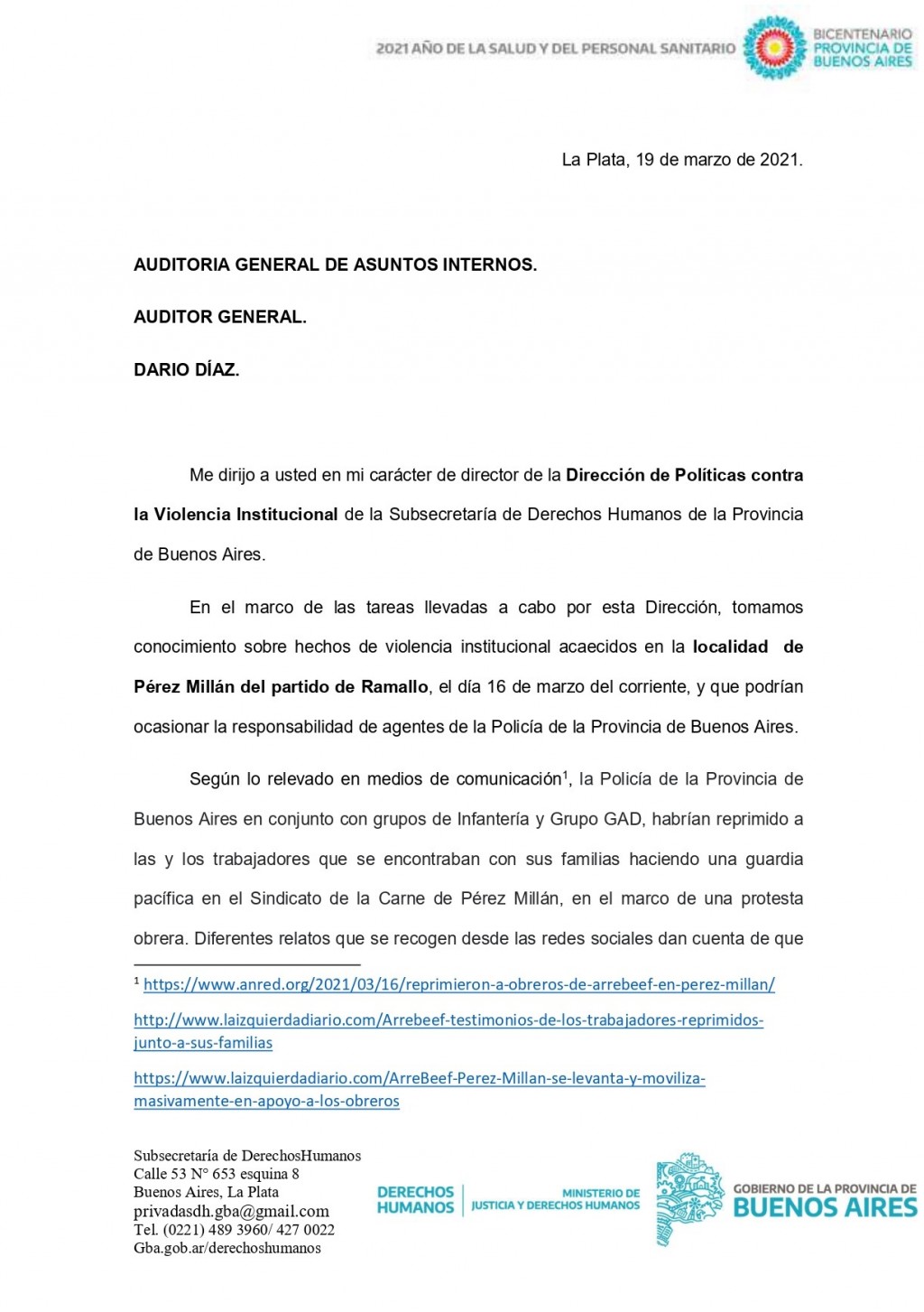 La nota dice: En el marco de las tareas llevadas a cabo por esta Dirección, tomamos conocimiento sobre hechos de violencia institucional acaecidos en la localidad de Pérez Millán del partido de Ramallo, el día 16 de marzo del corriente, y que podrían ocasionar la responsabilidad de agentes de la Policía de la Provincia de Buenos Aires.