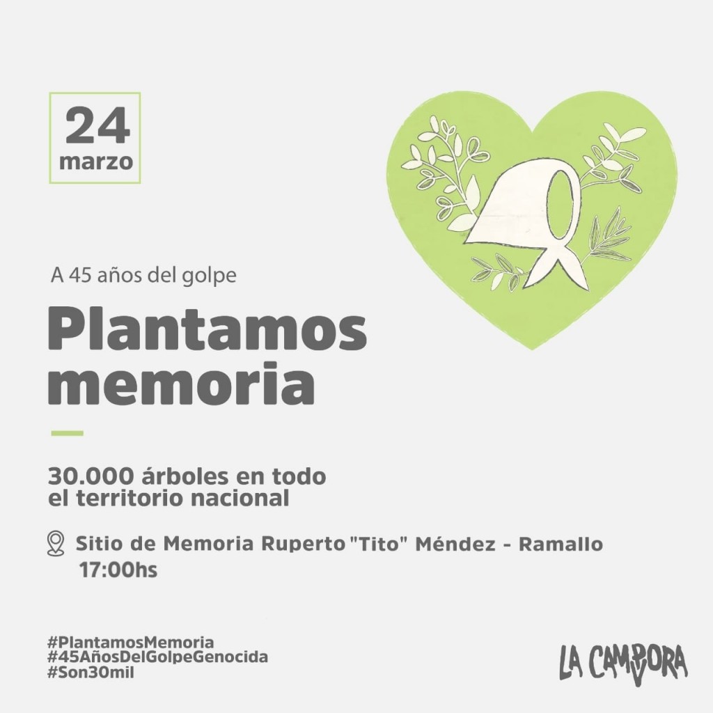 En tanto, el 24 de marzo a las 17 hs. en el sitio de la Memoria Ruperto "Tito" Mendez Leloir 137 de la ciudad de Ramallo donde se realizará un acto a 45 años del golpe "Plantamos Memoria".