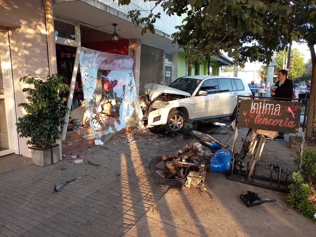 Un violento accidente se produjo en la tarde de este miércoles en Avenida Savio y San Martín de la ciudad de Ramallo. Por circunstancias que se deberán determinar una camioneta Mercedes Benz modelo GLK y una moto baja cilindrada terminaron impactando contra un local de lencería sobre la Avenida Savio en dirección hacia San Nicolás. Las imágenes al llegar al lugar describían la situación. Muchos vecinos se agolparon para ver que sucedía. Rápidamente llegó personal del sistema de emergencia municipal, bomberos voluntarios, policía y guardia urbana.