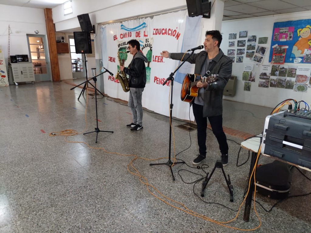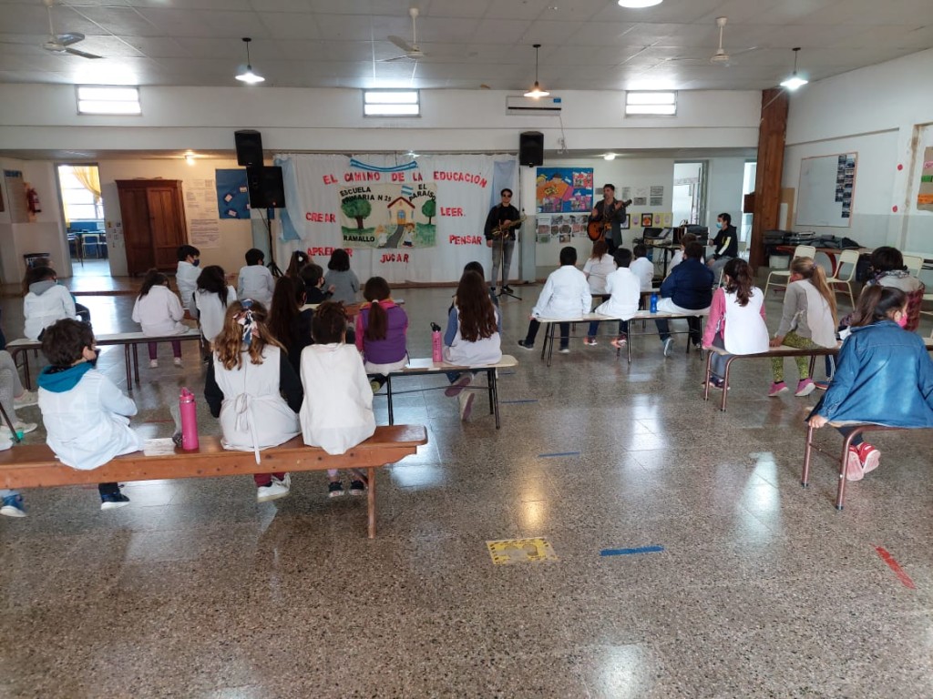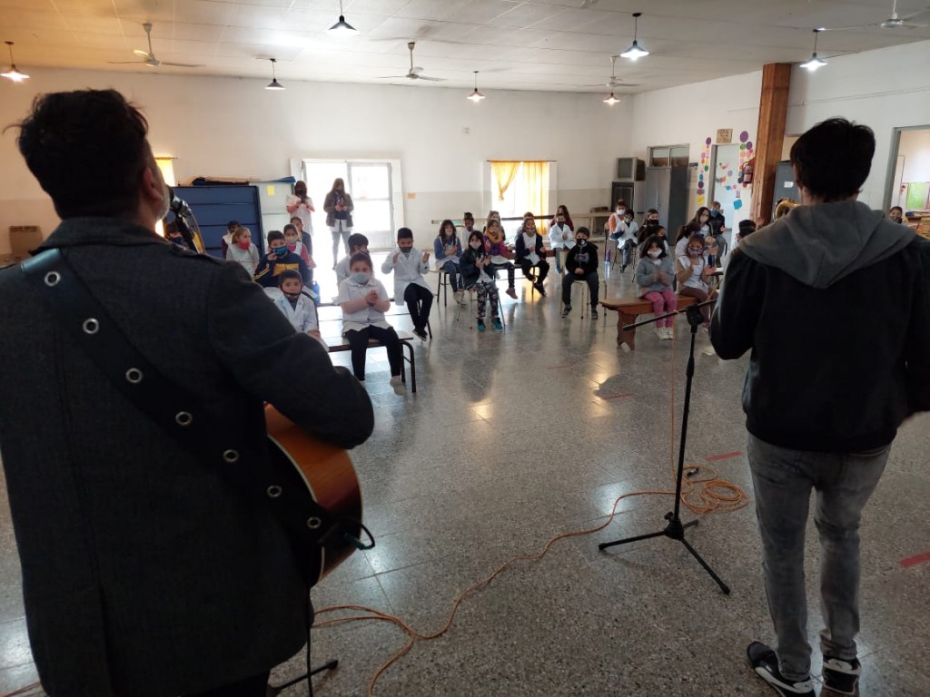 En el marco de los encuentros en los que la centenaria institución ramallense y la Provincia vienen desarrollando desde el último verano, el Instructor en Percusión Cristian Flores y el Director de la Banda Julio Clark alegraron a los alumnos con un repertorio de canciones populares.