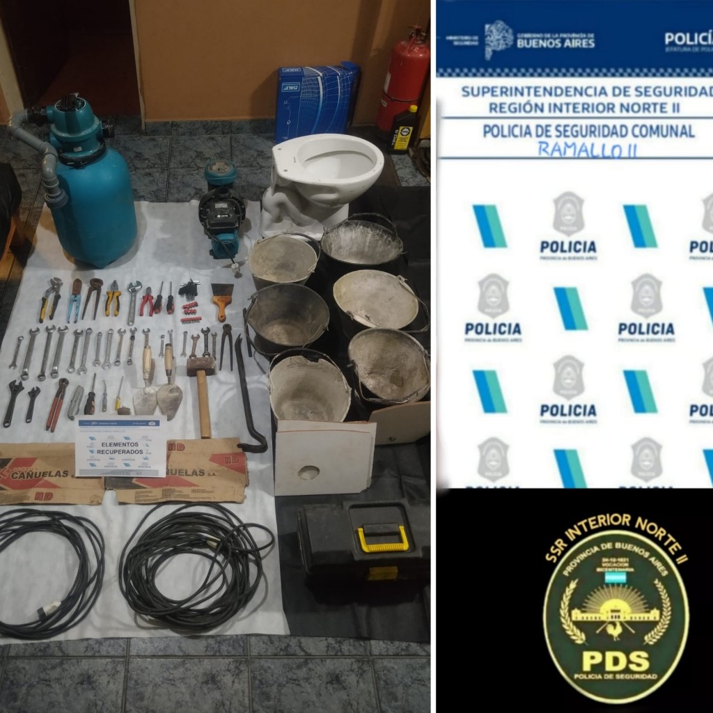 Horas más tarde procedieron al secuestro de herramientas varias, baldes de albañilería, cerámicos, dos alargues, un inodoro, bomba de agua y filtro, todo los objetos fueron reconocidos por la victima.