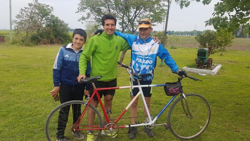 “Somos cuatro o cinco muchachos que trabajamos, se formó una agrupación Ramallo Biker y hubo gente que colaboró para que entre todos podamos armar la bicicleta para Adrián Acevedo. Nosotros nos dimos cuenta que estaba interesado y nos pusimos trabajar para construir una bicicleta doble, es una bici de ruta, rodado 28, no te das una alegría que tenía” dijo Marsili en el inicio del dialogo y luego describió “la mountain bike es una bicicleta para andar en tierra, nosotros armamos una pistera, tiene un cuadro más liviano y rodado 28, Matías Menarvino nos ayudo con los repuestos, Daniel Montesino y Jorge Tonelli también nos brindaron una gran ayuda y después torno y maquina de soldar… ya salió a la ruta y esta rodando” dijo con naturalidad Marsilli que tiene un taller metalúrgico y es tornero, y fue quien con todo el material armó la bicicleta que estará viajando con los ciclistas que se suman a la “Vuelta de Ramallo”.