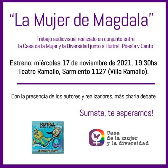 En el marco del Mes de Orgullo, desde la Casa de la Mujer y la Diversidad Ramallo junto Huitral, poesía y canto; invitan a la comunidad a participar de la presentación del Video Clip musical “La Mujer de Magdala”, un trabajo audiovisual realizado en forma conjunta. El estreno será este próximo miércoles 17, a las 19:30hs en el Teatro Ramallo, ubicado en calle Sarmiento 1127 (Villa Ramallo).