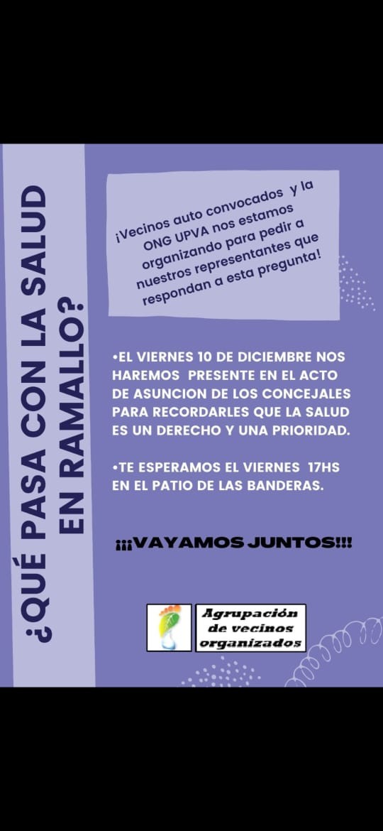 En tanto, el pasado 3 de diciembre ambas organizaciones estuvieron presente en el paseo “Viva el Río- Leandro Manuel Mansilla” peticionando de la misma manera ante cada uno de las personas que llegaban para el acto de bendición de a las aguas e inicio de la temporada 21/22. En el ingreso al Paseo “Viva el Río- Leandro Manuel Mansilla” se podía observar en horas de la mañana a la Agrupación de vecinos Ramallo entregando folletos con las siguientes preguntas: ¿Te preocupa la salud en Ramallo? ¡A nosotros también! ¿Te acordás que se hizo un campamento sanitario? ¡Aún no tenemos los resultados! ¡Exijamos al municipio que los dé a conocer para construir una salud pública de calidad!