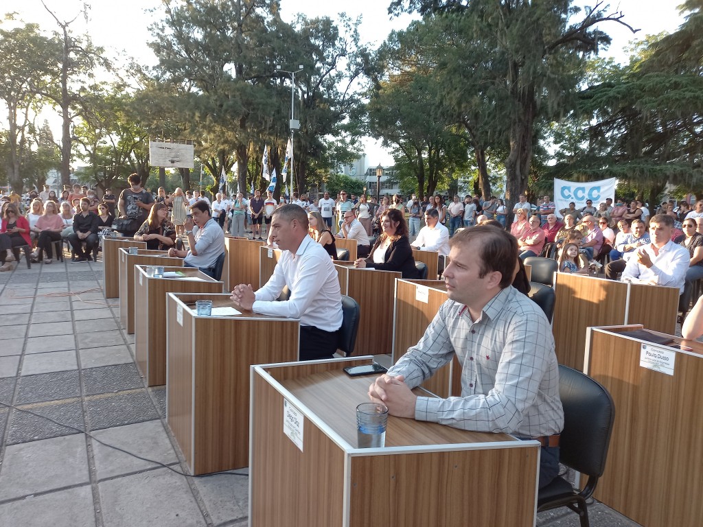 La tarde caía en el horizonte en la plaza principal “José María Bustos” cuando el concejal Cristian Cardozo, ahora presidente del bloque oficialista propuso a Jerónimo Vives –concejal MC—como secretario del bloque, fue entonces que Diego Díaz, presidente de la Unión Cívica Radical y ex presidente del bloque hasta hacía algunas horas nada más dijo que se iba a abstener. Luego la concejal Paula Dusso dijo “en el mismo sentido solicito la abstención”. El edil no argumentó demasiado y eso dio lugar a que su compañero de bancada de Pérez Millán Cardozo pidiera explicaciones.