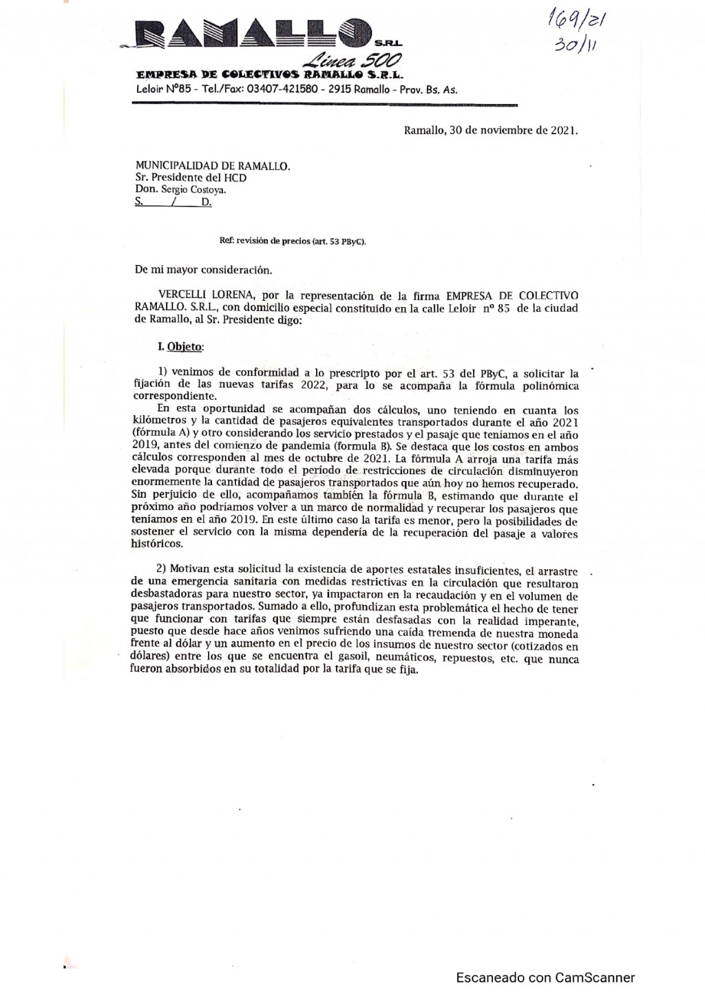 La nota detalla que “en esta oportunidad se acompañan dos cálculos, uno teniendo en cuenta los kilómetros y la cantidad de pasajeros equivalentes transportados durante el año 2021 (formula A) y otro considerando los servicios prestados y teniendo cuenta los pasajes del 2019, antes del comienzo de la pandemia (formula B). Se destaca que los costos en ambos los cálculos corresponde al mes de octubre del 2021. La formula A arroja una tarifa más elevada porque durante todo el periodo de restricciones de circulación disminuyeron enormemente la cantidad de pasajeros transportados que aun hoy no hemos recuperado. Sin perjuicio de ello, acompañamos también la formula B, estimando que en el próximo año (por el 2022) podríamos volver a un marco de normalidad y recuperar los pasajeros que teníamos en el 2019. En este último caso la tarifa es menor, pero la posibilidad de sostener el servicio dependería de la recuperación del pasaje a valores históricos”