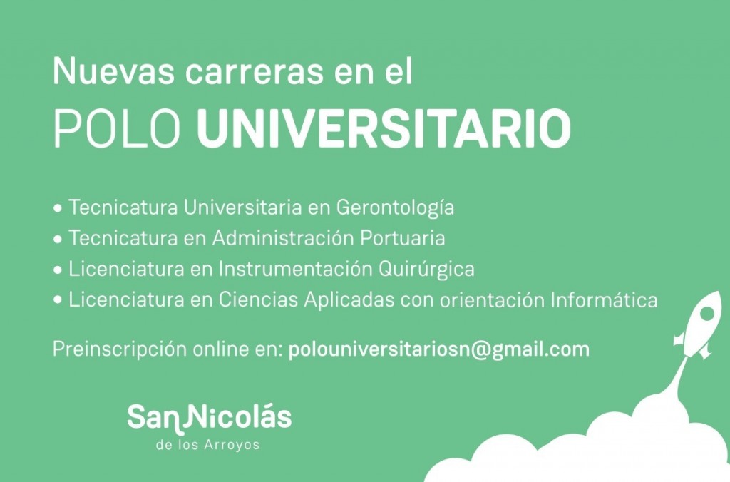 El Polo Universitario San Nicolás continúa pre-inscribiendo a sus cuatro nuevas carreras: Tecnicatura en Administración Portuaria, Licenciatura en Ciencias Aplicadas con orientación Informática, Licenciatura en Instrumentación Quirúrgica, Tecnicatura Universitaria en Gerontología.