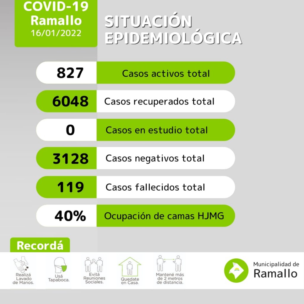 La cantidad de víctimas fatales ascendió a 119 en las últimas horas. El nivel de ocupación de camas en el Hospital José María Gomendio es del 40 por ciento. La suba de casos fue exponencial entre fin de año y el 12 de enero. Hoy los números marcan 6997 positivos (827 activos y 6048 recuperados), 0 Casos en estudio, 3128 casos negativos, 119 fallecidos, casos positivos: 157 (62 Ramallo, 56 Pérez Millán y 39 villa Ramallo). La variante Ómicron es la de mayor circulación en la región sanitaria según los datos informados.