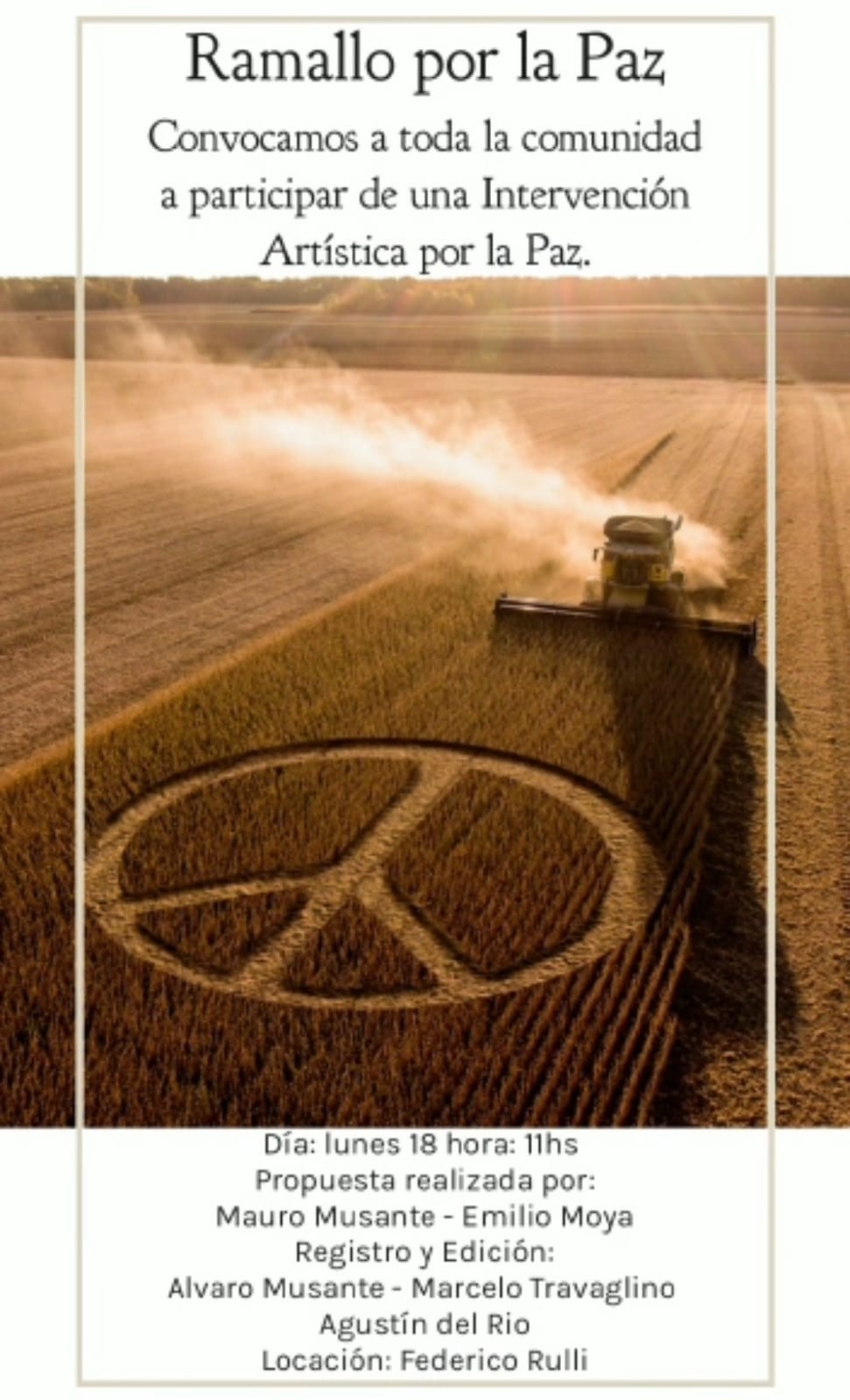 Una original propuesta fue llevada a cabo ayer por el artista plástico ramallense, Mauro Musante, junto a su profesor Emilio Moya y un grupo de profesionales abocados a la comunicación en un campo del distrito. La iniciativa de “Ramallo por la paz” fue pensada para enviar un mensaje al pueblo ucraniano y poder hacerlo extensivo a lo largo y ancho del planeta. El profesor Moya contó que la idea fue trabajar en un campo que sufrió el impacto de la sequía y la inundación, todo en este tiempo de clima tan extremo que vivió el campo, y en medio de esa situación la analogía como metáfora de la tierra y el impacto de la guerra.