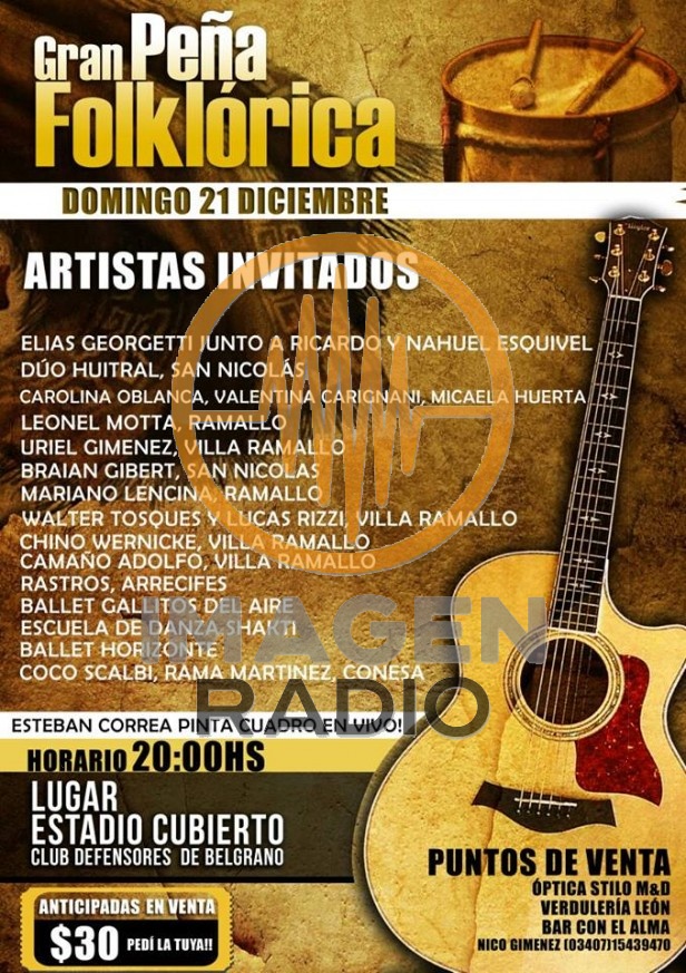 El próximo domingo a las 20:00, en las instalaciones del Club Defensores de Belgrano, se realizará una peña folkórica a beneficio de un joven de Ramallo que sufrió un importante robo de sus elementos de trabajo. Numerosos artistas se harán presentes en el escenario del estadio cubierto.La entrada tiene un valor de $30