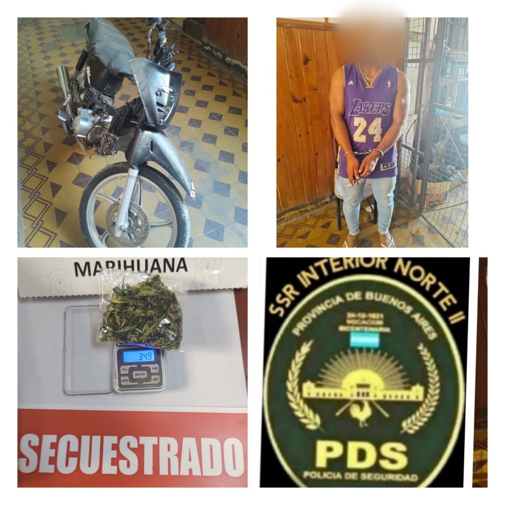 Procedieron a la aprehensión de un joven de 25 años en Juan B. Justo y Santa Rosa quien momentos antes sustrajo motocicleta del interior de una finca en barrio Valle de Oro en Villa Ramallo y tras realizarle cacheo preventivo se le incauto hojas de Marihuana en bolsa de nylon.