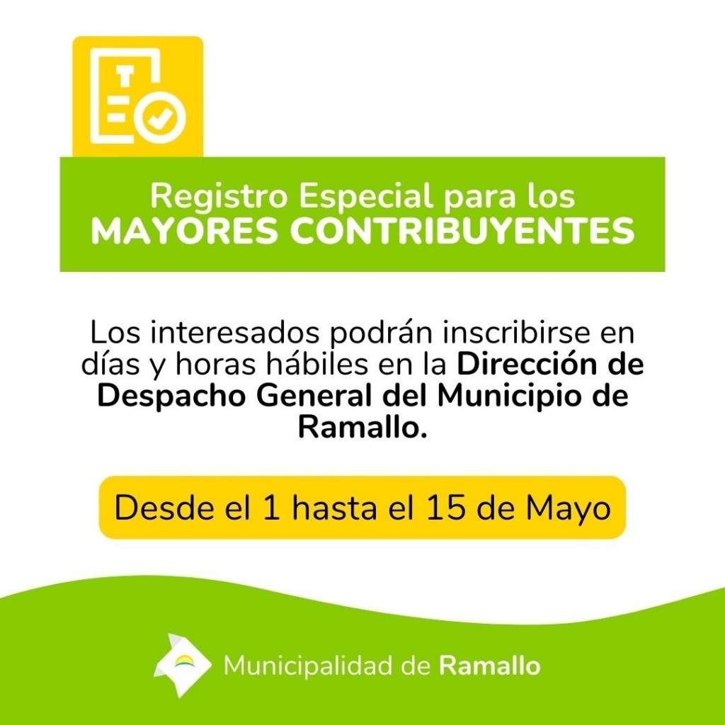 La Municipalidad de Ramallo, informa a los contribuyentes que a partir del día 1º de mayo de 2023 y hasta el día15 de mayo de 2023 Inclusive; permanecerá abierto el “Registro Especial para los Mayores Contribuyentes”: según lo establece el Artículo 94º - Ap. 1 - Decreto - Ley 6769/58 “Ley Orgánica de las Municipalidades”