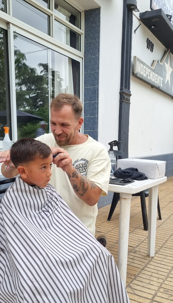 Tal como lo había anunciado en sus redes sociales, Aranguren comenzó a cortar el pelo desde las ocho de la mañana, y la respuesta fue inmediata. “Vine a las ocho y ya tenía gente esperando, no me imaginé que iba a arrancar así. Recién ahora tengo un respiro para cambiarle el agua al mate”, contó entre risas, mientras seguían llegando clientes improvisados.