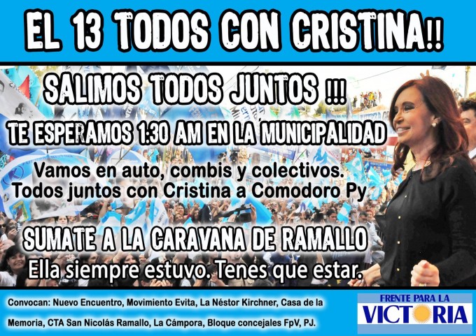 Distintas organizaciones sociales y kirchneristas estarán viajando este miércoles a Buenos Aires. Una caravana partirá en la madrugada de este miércoles desde Ramallo a apoyar a la Ex Presidenta Cristina Fernández de Kirchner cuando declare en los tribunales federales de Comodoro Py.