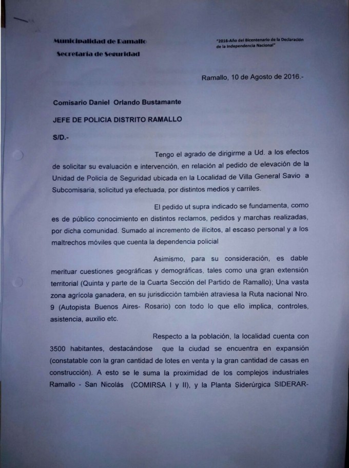 Con esta nota dirigida al Jefe de Policía de Ramallo, Comisario Daniel Bustamante, para ser remitida al Ministerio de Seguridad a los efectos de solicitar la elevación a SUBCOMISARIA de la unidad policial situada en Sanchez (Villa General Savio).
