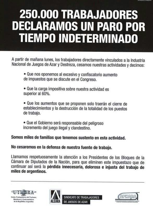"Nos oponemos al excesivo y confiscatorio aumento de impuestos que se discute en el Congreso", señala una solicitada firmada por la Agencia de Apuestas y Afines de la República Argentina (APHARA); la Unión de Trabajadores de Turismo, Hoteleros y Gastronómicos de la República Argentina (UTHGRA); y Aleara.