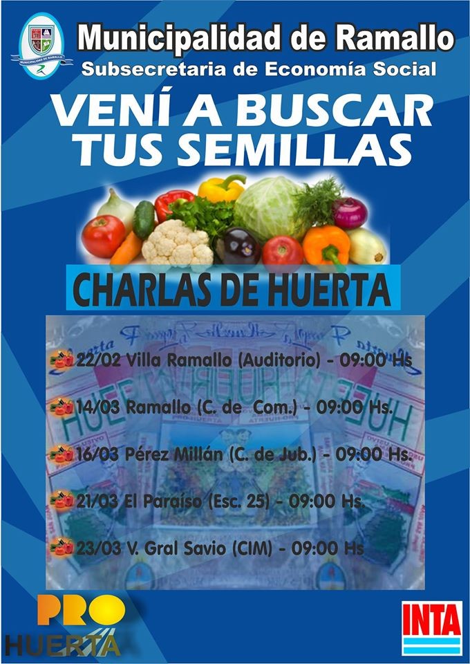 Desde la subsecretaria de economía social de la Municipalidad de Ramallo junto al servicio social de la unidad Sanitaria de Villa Ramallo, invitan a la charla con ingeniero del INTA y entrega de semillas.
