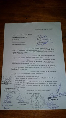 TGD padres TEA Ramallo entregó este miércoles una nota al Intendente Municipal Mauro Poletti, pidiendo que se refuercen los controles para evitar la venta de pirotecnia en el partido de Ramallo, así como también hacen cumplir la ordenanza de prohibición de uso y venta de la misma.