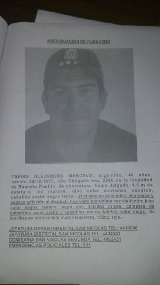 Desde la policía de la provincia de Buenos Aires se solicita dar con el paradero de Alejandro Marcelo Farías de 40 años nacido y residente en la ciudad de Ramallo. Todos los que puedan aportar información comunicarse al 48333 o al 421333.