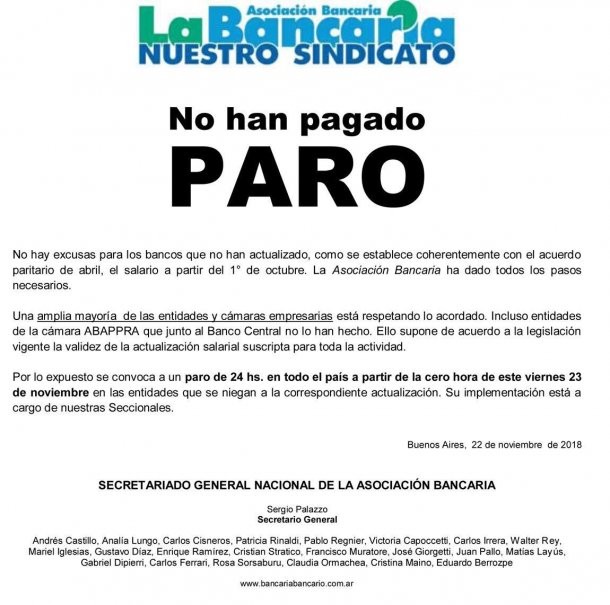 El gremio de trabajadores bancarios anunció un nuevo paro de 24 horas para este viernes, con motivo del no pago de la clausula gatillo acordado dentro de las paritarias vigentes.
