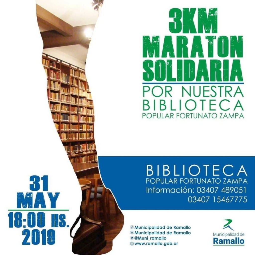 El próximo 31 de mayo a las 18:00hs. en Villa Ramallo se correrá una maratón a beneficio de la biblioteca popular Fortunato Zampa. La actividad es organizada por la Secretaria de Deportes Municipal junto a la conducción de la biblioteca y tendrá un costo de inscripción de $50 o $100.