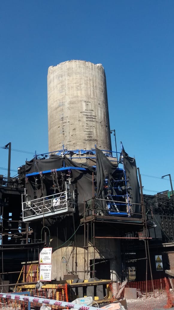 La obra que se estaba realizando consiste en la demolición de la chimenea utilizando una plataforma específica, formada con tres anillos circulares de zunchado que lo amarra a la chimenea.