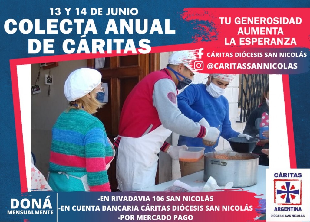 Como todos los años, el próximo 13 y 14 del corriente, se realizará en todo el país, la Colecta Anual de Cáritas bajo el lema “Tu generosidad aumenta la esperanza”, a través de la donación de dinero de todos los que deseen colaborar. Este año, por razones que son de público conocimiento, el aporte será efectivizado solamente electrónicamente.