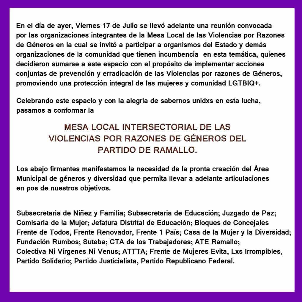 Celebrando este espacio y con la alegría de sabernos unidxs en esta lucha, pasamos a conformar la MESA LOCAL INTERSECTORIAL DE LAS VIOLENCIAS POR RAZONES DE GÉNEROS DEL PARTIDO DE RAMALLO.