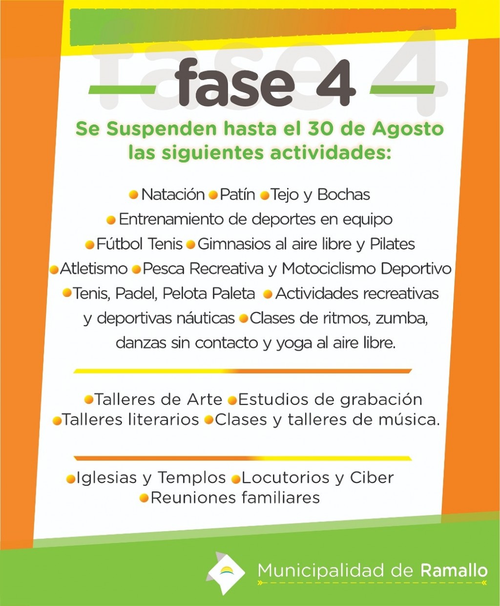 Este martes 18 de agosto, se firmó el decreto 470/20 que establece la suspensión de actividades cumpliendo con la Fase 4 establecida por la Provincia de Buenos Aires en el Partido de Ramallo.