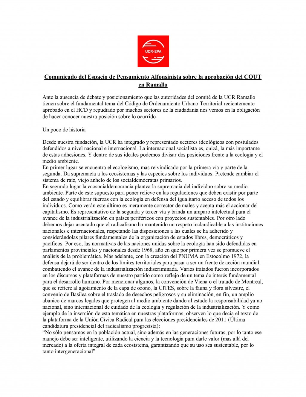 Desde hace años el radicalismo progresista hoy nucleado en el EPA tiene su representación en las causas ambientales locales a través de afiliados que haciendo uso de su responsabilidad ciudadana colaboran con las organizaciones que llevan adelante las diferentes luchas. Siempre hemos acompañado las distintas propuestas basadas en el diálogo, el consenso y la descentralización en la toma de decisiones municipales favoreciendo la valoración del compromiso ciudadano con la soberanía que debe tener todo pueblo organizado. En la problemática específica del COUT apoyamos cada paso dado colectivamente por estas organizaciones ciudadanas siendo la última la creación del dispositivo de participación ciudadana orientado a recolectar diferentes propuestas y proyectos que tienen sobre este tema los vecinos. Una acción positiva, concreta que recolecta la información necesaria y amplía la mirada en la toma de decisiones sobre la creación de un nuevo código beneficioso para todos los ramallenses.