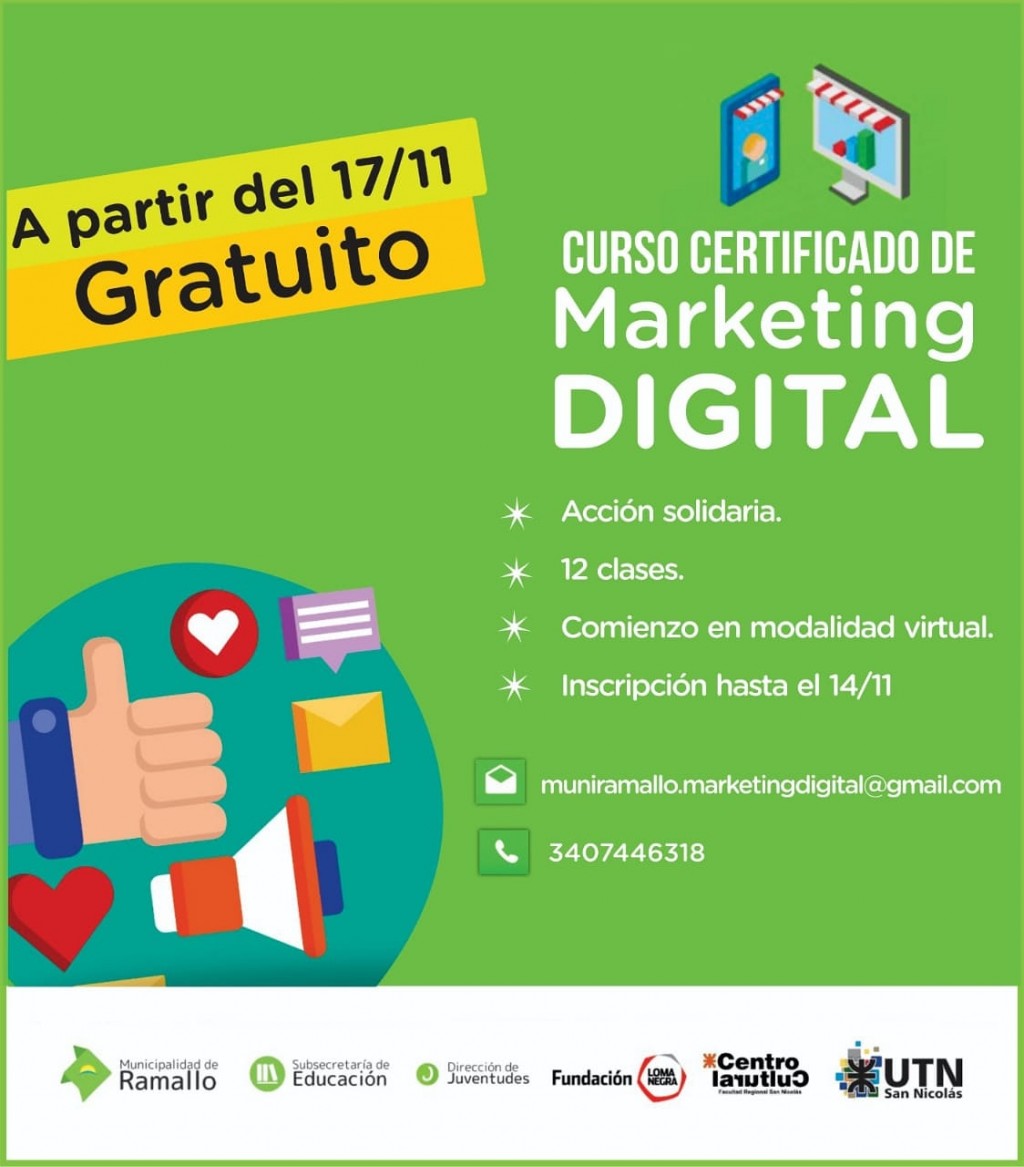 La Municipalidad de Ramallo, en conjunto con la Fundación Loma Negra y el Centro Cultural de la UTN San Nicolás invita a inscribirse al curso gratuito destinado a jóvenes emprendedores o en vía de emprender, desde los 18 hasta los 35 años, el mismo comenzará en modalidad virtual el próximo martes 17 de noviembre.
