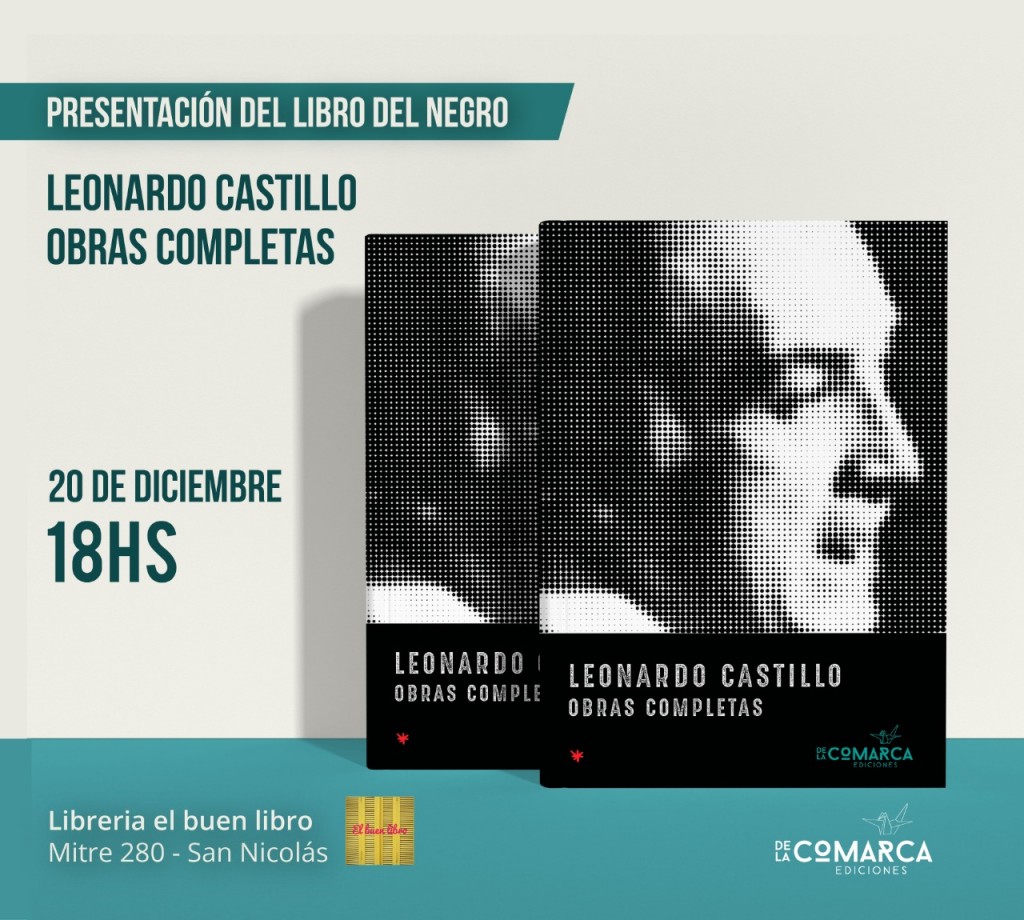 El próximo lunes 20 de diciembre la Editorial De La Comarca presenta el libro “Leonardo Castillo obras completas” desde la librería El Buen Libro (Mitre 280, San Nicolás). El evento será trasmitido en vivo por la cuenta oficial de Facebook.